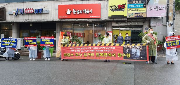사실 이 주장은 맞대응할 논리가 특별한 게 없다. 사원이 건축되면 예배를 드리기도 편하고 무슬림끼리 모이기도 쉬워서 가능하면 근처로 다 이사오려고 할 것이기 때문이다. 하지만 테러 문제는 너무 앞서나가는 것으로 보인다. 내가 개인적으로 부산의 이슬람 사원에서 들었던 말인데 (그래서 근거는 희박하다) 부산의 이슬람 사원은 테러위험이 있는 이슬람 교도가 입국하면 먼저 신고한다고 한다. 그 사람들이 문제를 일으키면 자신들이 피곤해진다는 것을 알아서 먼저 알아서 정부에 협조하는 것이라고 한다. 그렇게 일반적으로는 테러까지는 일어나지는 않는다. 위의 사진의 사건은 프랑스 교사가 수업시간에 무함마드에 대한 만평을 보여줘서 생긴 사건인데 하필 어떤 학생이 부풀려서 이야기 하는 바람에 분노에 찬 이슬람 교도가 저지른 만행이다(글 제일 끝에서 다시 설명하겠다)