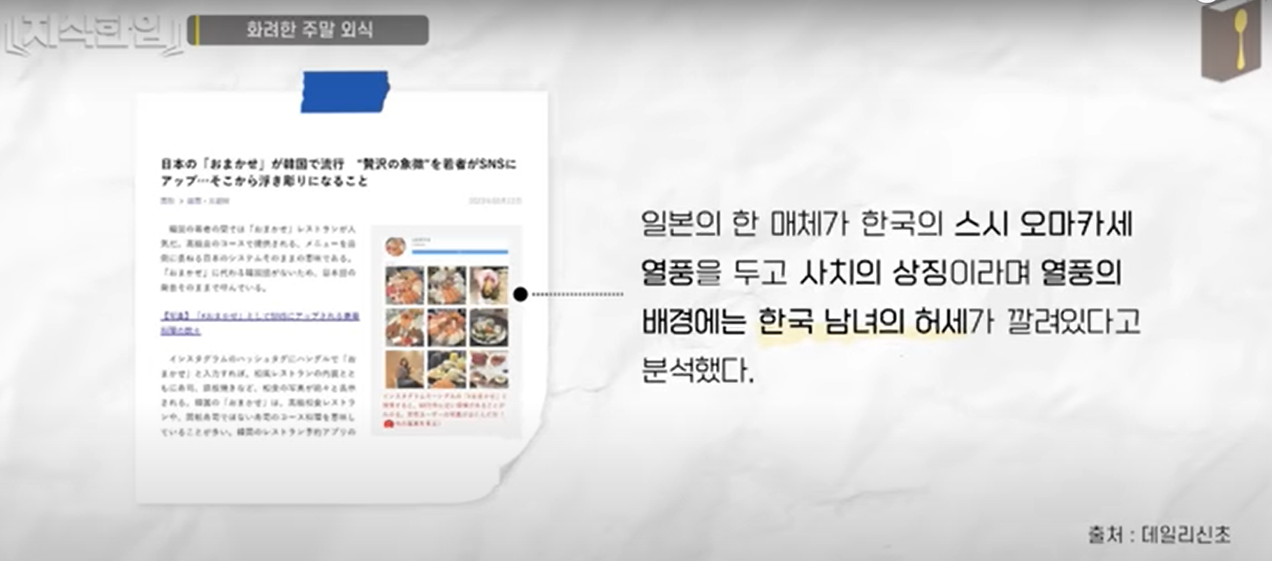요새 젊은이들의 소비패턴이 양극화 되고 있다. 점심은 편의점에서 때우고(먹는다는 것보다는 때우다, 해결하다 라는 표현이 맞다고 본다) 그 돈 아껴서 오마카세에서 비싸게 외식을 한다고 한다(호텔 뷔페나 호텔 후식같이 비싼 것들도 자주 이용한다고 한다). 이렇게 비싼 것을 선택하는 이유는 자기 만족이라는 것도 있지만 SNS에 올리는 것도 중요한 이유가된다. 일본언론에서도 한국젊은이들의 소비형태를 보며 허세라고 비난하였다고 한다.