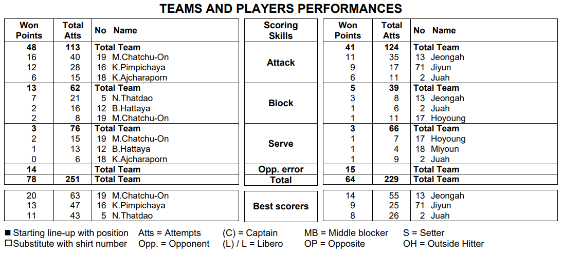 태국은 공격시도 113번 중에 48점(42%)을 내었으며 블로킹 시도는 우리 공격 124번 중에 62번 시도(50%)해서 13점(21%)을 내었다. 서브에이스는 역시 3개였다.