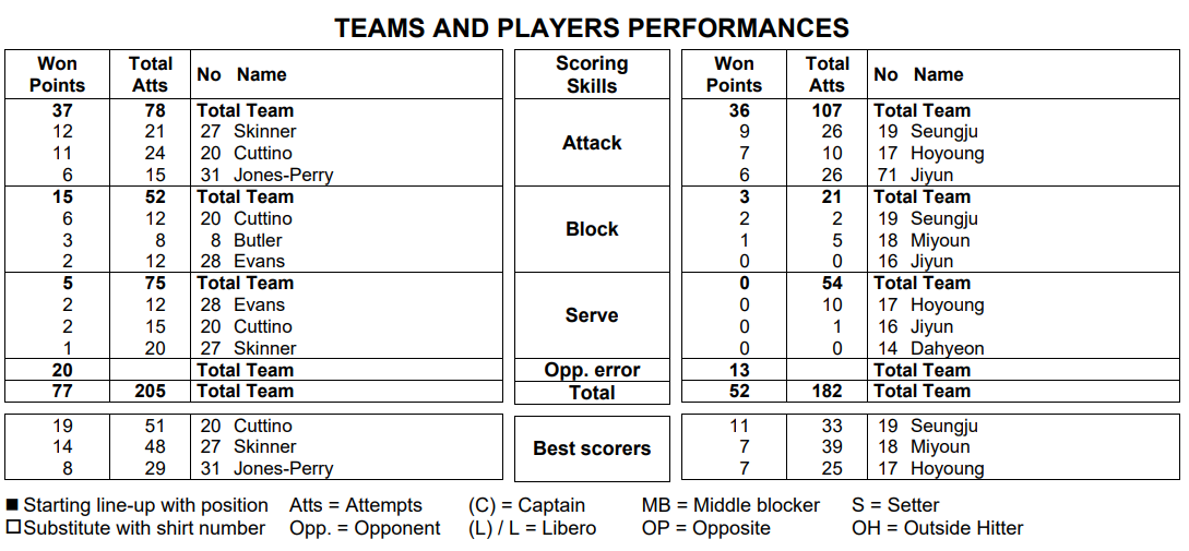 우리나라를 보자. 공격은 107번 시도에 36번의 성공(33%)이다. 블로킹은 상대의 78번의 공격시도 중에 21번(유효블로킹, 방해는 했음 27%)이 우리나라의 유효블로킹이고 유효블로킹 한 것 중에 3번(14%)을 블로킹 득점했다. 서브는 54번 시도해서 서브에이스는 없었다.