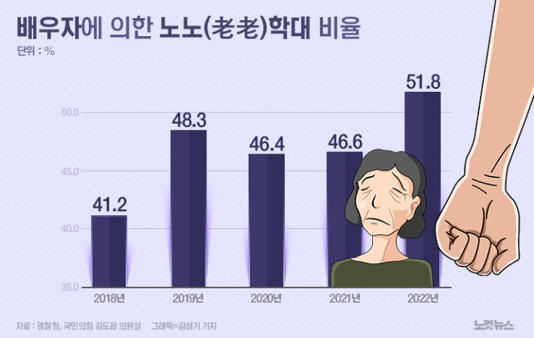 "검거까지 이어진 노인학대 중 '노노'학대의 비율은 △2018년 41.2%(1519건 중 626건) △2019년 48.3%(1943건 중 939건) △2020년 46.4%(2336건 중 1083건) △2021년 46.6%(2886건 중 1345건) △2022년 51.8%(3195건 중 1655건)까지 늘어났다."