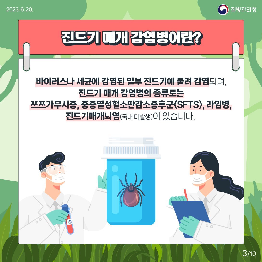진드기에 물리면 감염병에 걸릴 수 있다는 사실, 알고 계시나요?진드기 매개 감염병에 대해 자세히 알아보고, 야외활동 시 진드기에 물리지 않도록 예방수칙을 꼭 지켜주세요!📌진드기 ...