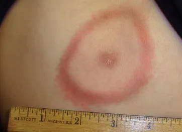 진드기에게 물리게 되면 아래 그림같은 유주성홍반(erythema migrans)이 생기게 되며 통증이 없다(운이 나쁘게도 안보이는 곳을 물리게 되면 물렸는지도 모른다). 증상은 거의 독감하고 같다. 치료를 안하고 두면 심각한 병까지 같이 오게 되지만 치료법이 잘 되어 있어서 병원에 가면 된다.