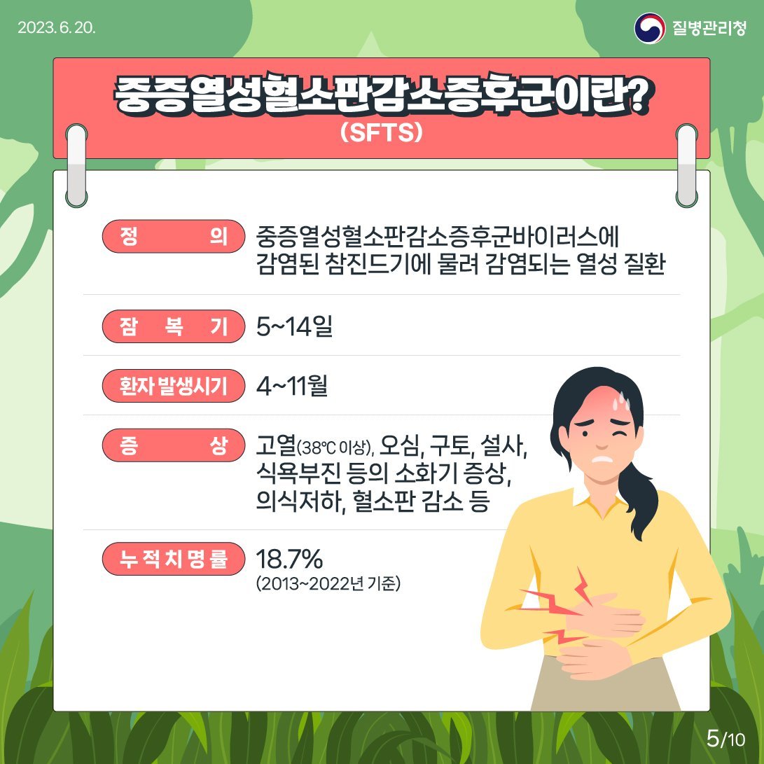 사실 이 병 때문에 이 글을 적었다고 해도 과언이 아니다. 중증열성혈소판감소증후군(SFTS)은 올해 19명이 발병했는데 그 중 4명이 사망하였다(21%이다. 올해가 좀 높다. 전체적인 치사율은 6%이다. 올해 사망자 수는 기사 쯔쯔가무시증‧SFTS 감염병 환자 절반은 ‘농작업’ 중 물려…"몸에 진드기 붙으면 병원에서 제거해야"를 참조하였다). 작은소참진드기에게서 옮는 바이러스성 질환으로 아직까지는 동아시아에서만 발견되었다고 한다. 진드기에게 물린다고 100% 걸리는 질병이 아니며 진드기에 따라 바이러스가 없는 개체들도 있어서 물렸다고 걱정하지 않아도 된다.