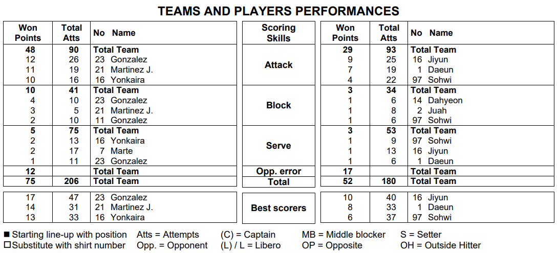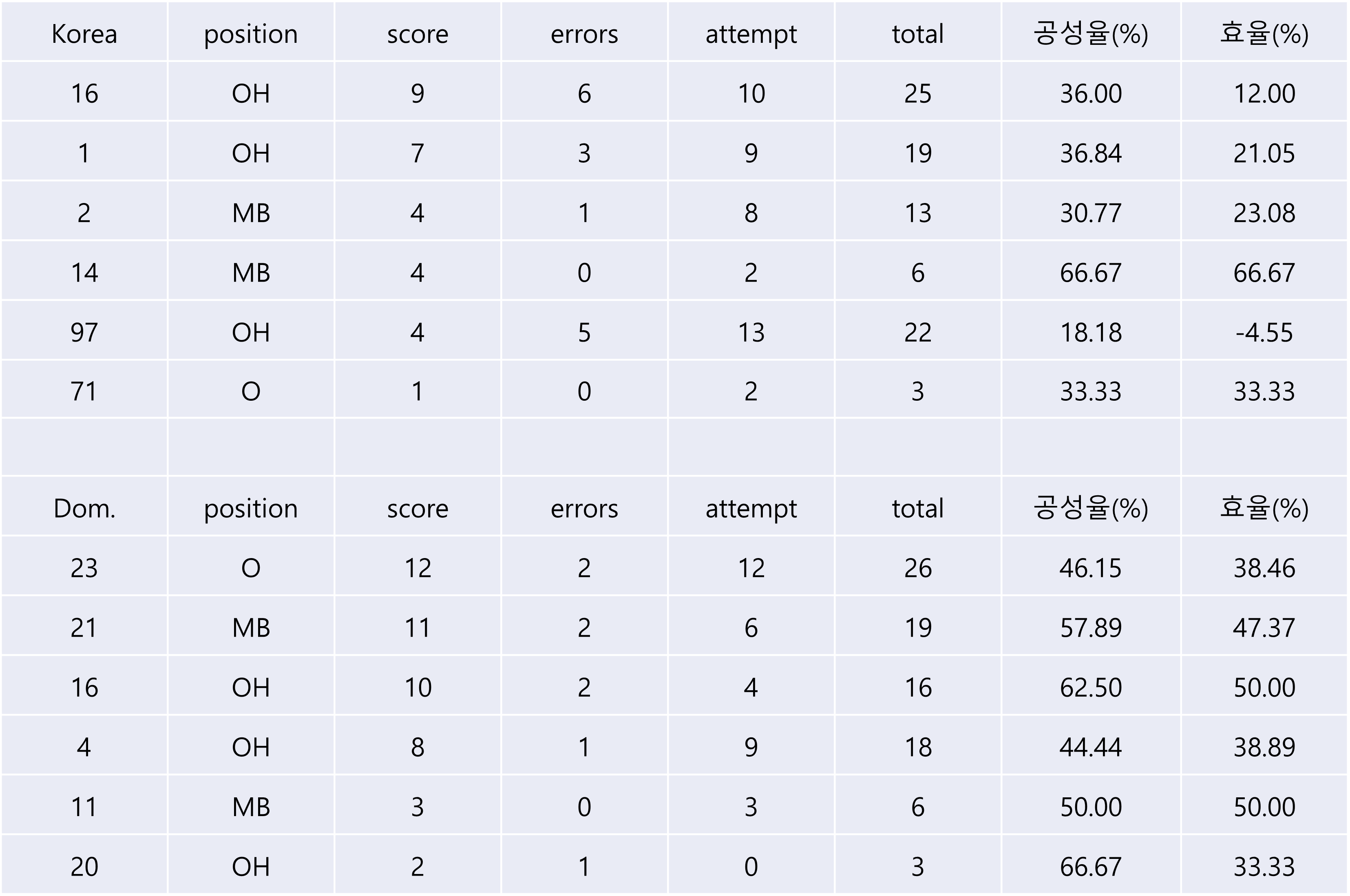 공격수와 미들블로커의 공격수치만 비교한 표이다. 제일 앞의 숫자는 등번호이다(1번이 김다은, 2번이 이주아, 14번이 이다현, 16번이 정지윤, 71번이 문지윤, 97번이 강소휘이다). 전체 시도회수가 total, 시도는 했는데 점수를 주거나 내지 못한 것은 attempt, 점수 낸게 score, 범실한 것이 errors로 표시되어 있다. 단순 공격성공율(표에서 공성율이라고 표기됨)은 점수 / total X 100 이고 효율은 (점수-범실) / total X 100 이다.