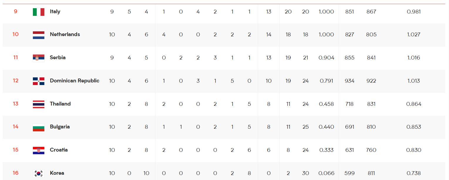 아래는 현재의 순위이다. 중국과 일본이 6, 7위에 보인다. 우리는 제일 밑에 있다. 승점이 0인 나라도 우리가 유일하다. 1-3으로 진 경기가 2개, 0-3으로 진 경기가 8개이다. 남은 2경기는 현재 순위 6위의 중국과 2위의 폴란드이다. 일본도 1, 3위를 이겼는데 라는 생각으로 기대하지는 말자. 그냥 맘편하게 0-3 예상하고 보는 게 속이 편하겠다. (우리와 경쟁하던 크로아티아는 우리와 태국을 3:0으로 2번이겼다)