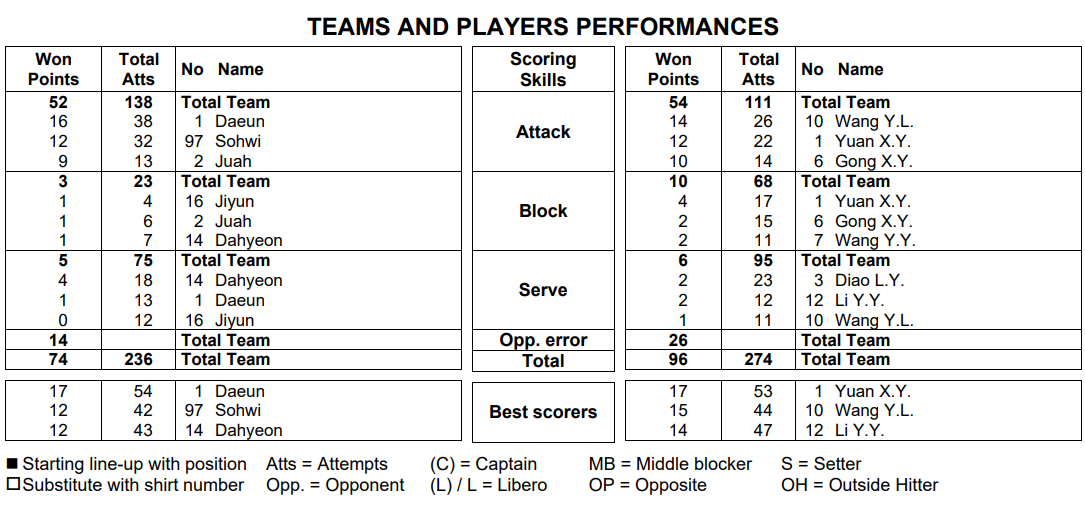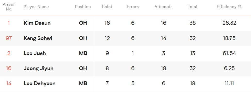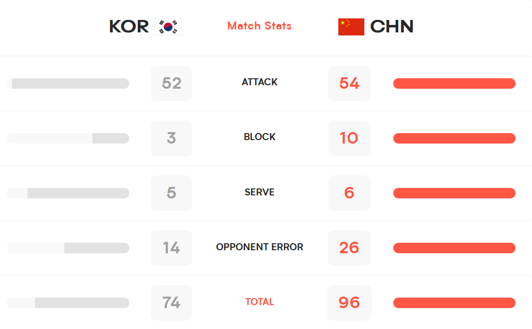 공격점수가 2점 차이 밖에 안났던 경기가 처음이라 표를 보는데 좀 생소하다. 우리는 공격시도 138번 중에 52점(38%), 중국은 공격시도 111번 중에 54점(49%)을 내었다. 공격성공율이 11% 정도의 차이를 보인다. 기존의 다른 팀과의 경기에 비해서는 차이가 적다. 그래서 공격점수로도 차이가 적다.