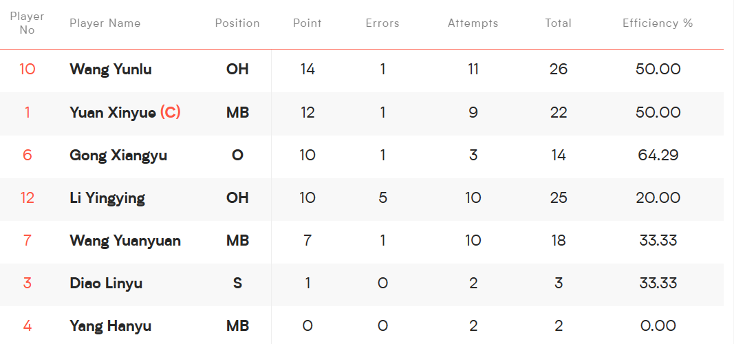 중국은 선수층에 변화가 없었다. 4연패 중이라 변화를 준다기 보다는 원래 있는 시스템을 정비하는 모습이다. 1, 3, 6, 7, 10, 12번 주전에 18번이 주전 리베로이고 필요시 17번이 보조로 들어오는 것도 기존의 2개의 경기(세르비아, 불가리아 전)과 같았다. 잘 안되고 있어서 하나의 시스템으로 계속 연습처럼 밀어붙이는 것으로 보인다. 중국의 12번 선수는 득점 랭킹에서도 상위권에 포함되어 있는데 이번에는 팀에서 3번째로 득점 하였다. 미들블로커 1번 선수와 다른 윙 15번 선수가 날아다닌 것으로 보인다. 12번 선수에 대해 우리나라가 생각보다 견제를 잘 한것으로 보인다(늘 팀 주 공격을 맡던 선수가 컨디션이 나쁜지 아니면 우리팀이 수비를 잘했는지 생각보다 점수가 낮다). 주포인 12번 선수가 4연패 기간에 효율이 30% 미만이라 중국이 고생하고 있는 것 같다(우리와의 오늘 경기에서는 효율이 20%까지 떨어졌다).