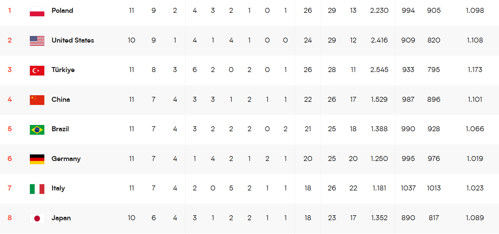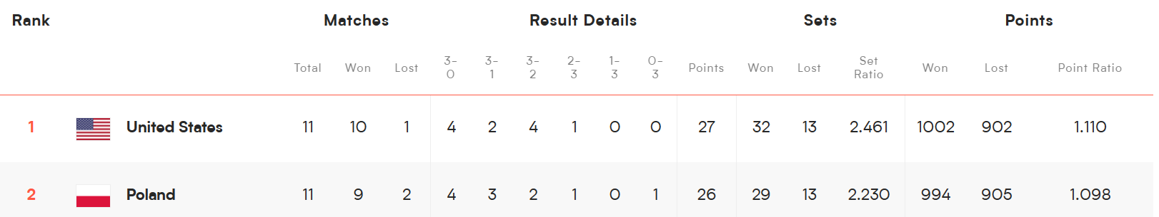 위 순위표는 과거이다. 아래그림처럼 미국이 독일을 3:1로 이겨서 미국이 1위로 바뀌었다(독일은 6위 그대로이다). 미국은 10승 1패이다. 미국은 2:3으로 딱 한번 졌는데 그게 일본전이다. 폴란드는 2패인데 미국전 2:3으로 진 것외에 1패는 네델란드에 0:3으로 진 것이다(네델란드가 현재 순위가 10위인데...).