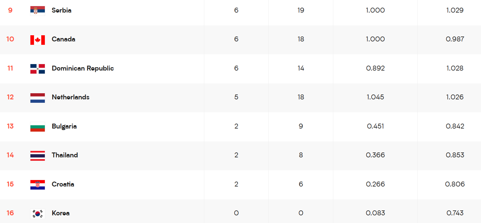1위인 폴란드는 챌린저 팀이다. 이번 리그에 참가한 16팀 중에 11팀이 코어팀이고 5개 팀이 챌린저 팀이다. 챌린저 5개팀은 폴란드, 캐나다, 도미니카 공화국, 불가리아, 크로아티아이다. 코어팀은 다음 리그에도 참가가 확정된 팀이며, 챌린저 팀 중에 꼴찌가 챌린저 리그로 강등된 후 올해 열리는 챌린저 리그의 1위가 내년 VNL에 다시 합류한다. 올해 챌린저 리그에서 1위해서 합류한 팀이 초반에 우리와 같이 연패하던 크로아티아이다. 결과적으로 크로아티아는 승리2번(우리나라, 태국)을 거둬서 승점이 6점이었다. 태국이 승리2번(우리나라, 캐나다)을 거두고 2-3으로 2번 져서 승점이 8점, 불가리아가 승리2번에 2-3으로 진 경기가 3번이라 승점이 9점이다. (우리나라는 승점이 0점이다. 앞에 말한 3팀이 우리 팀 위의 팀이다) 하위팀 순위 싸움은 강등권 결정 싸움인데, 태국(과 우리나라)은 코어팀이라 열외이고 불가리아와 크로아티아의 강등 싸움이었다. 크로아티아가 결국 다시 챌린저 리그로 내려갔다.
