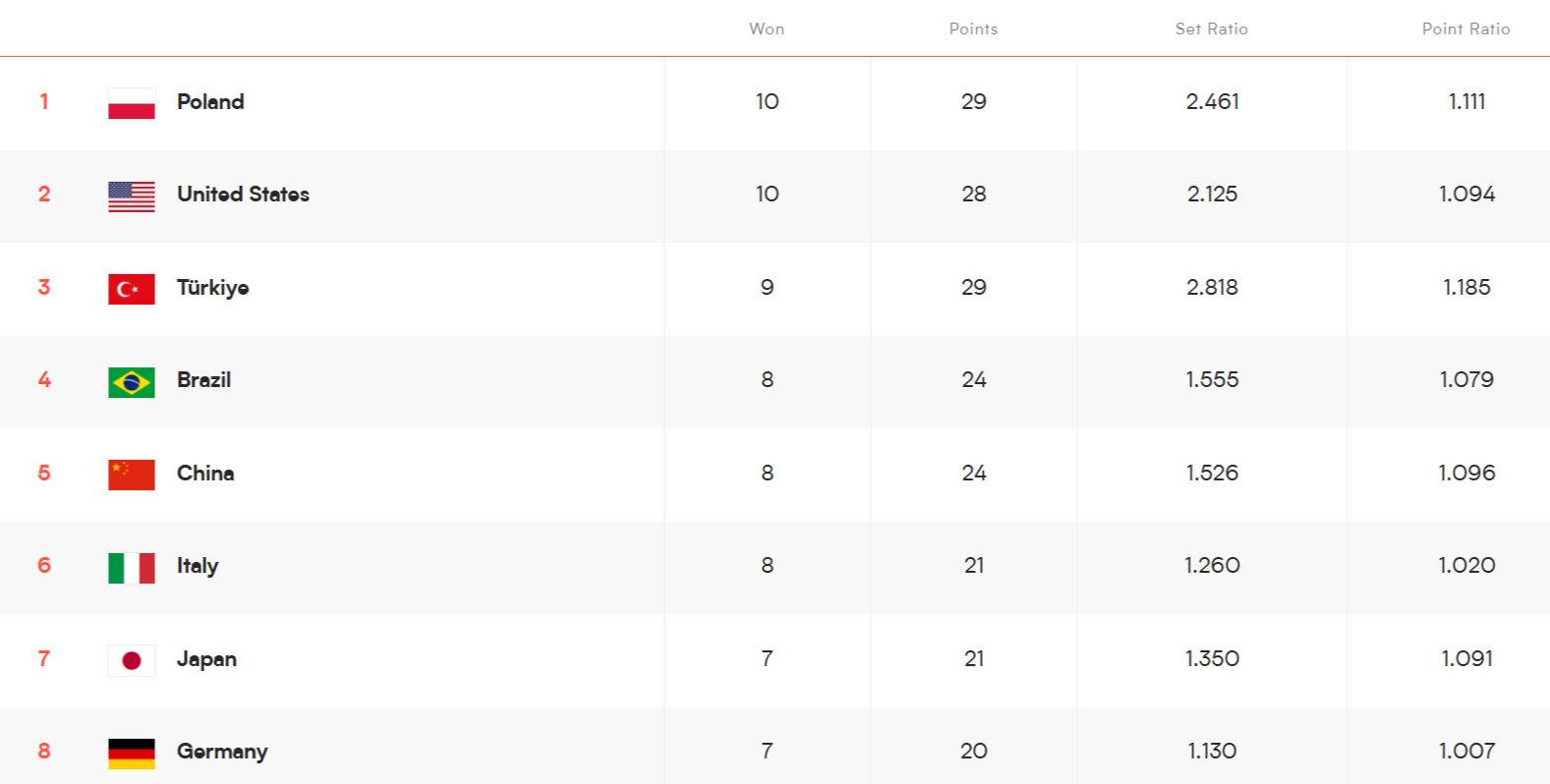예선리그가 끝났다. 폴란드가 1위팀이다. 1, 2, 3위는 세트 득실율이 2가 넘어간다. 미국이 생각보다 세트득실율이 낮다. 3:2로 이긴 네 경기와 2:3으로 진 두 경기 때문일 것이다. 세트 득실율은 튀르키예가 가장 높다(승점도 1위인 폴란드와 동점이다. 승수가 모자라서 3위이다). 튀르키예는 이길 때는 화끈하게 이겼기 때문 일 것이다(3:2로 이긴경기가 없다. 9번의 승리 중 3-0이 7번, 3-1이 두번이다). 터키는 2:3으로 진 2경기가 있고 0-3으로 진 1경기 있다. 폴란드도 상당히 높다. 폴란드도 3:2로 이긴 2경기, 2-3과 0-3으로 진 경기가 각각 1경기씩 있다. 미국과 폴란드의 1위 싸움도 재미있었다. 한국과 마지막 경기를 마친 폴란드는 순위를 1위로 한채 미국의 경기를 기다리고 있었다. 미국이 3:2로 이겨도 1위를 유지하는 상태였다(원래 전날 기준으로 승점차이가 1점 차이가 나서 미국이 1위였다. 하지만 그 때부터도 세트 득실이 미국이 나빴기 때문에 승점이 동률이면 미국이 불리했다. 그래서 중국과의 경기에서 1위를 유지하려면 승점 3점을 가져와야만 했다. 하지만 중국이 세트스코어 1:2로 지고 있던 상황에서 갑자기 힘을 내서 4세트를 승리했다. 미국의 1위가 날아가는 순간이었다. 내친김에 중국은 5세트까지 이겨서 마지막 1승을 보태었다. 이로서 중국은 6연승-4연패-2연승으로 경기를 마쳤다. 8승이 3팀인데 세트 득식율로 4~6위까지 정해졌다. 1, 2위나 7,8위가 아닌 다음에야 큰 변화가 없어서 별 문제가 없다.