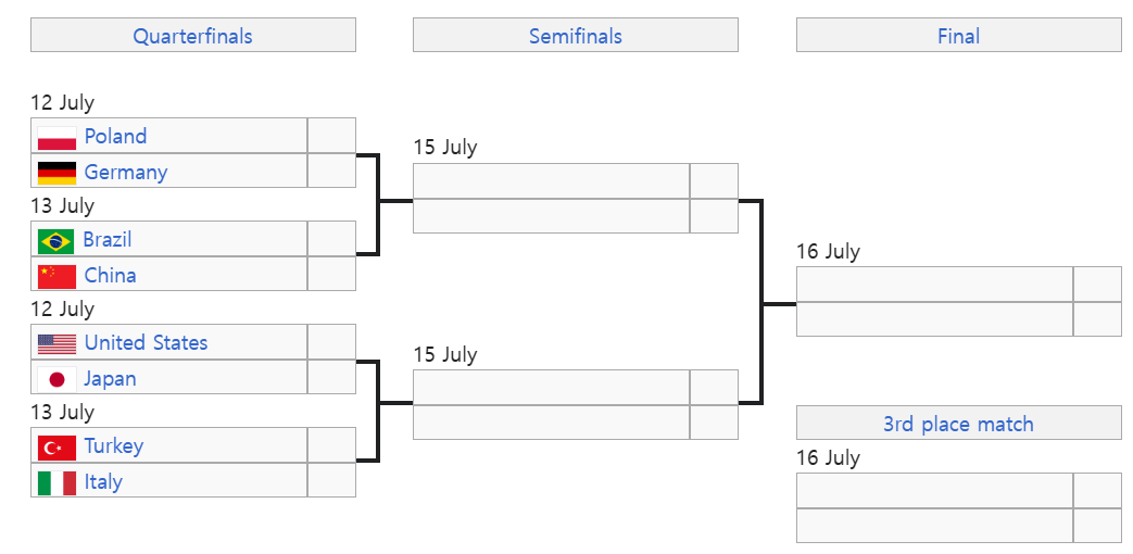 4강팀 예상을 하자면 폴란드 - 중국 / 미국 - 튀르키예 일 듯 하다. 내 예상은 틀릴 확률이 높지만 그래도 미리 적어본다.
