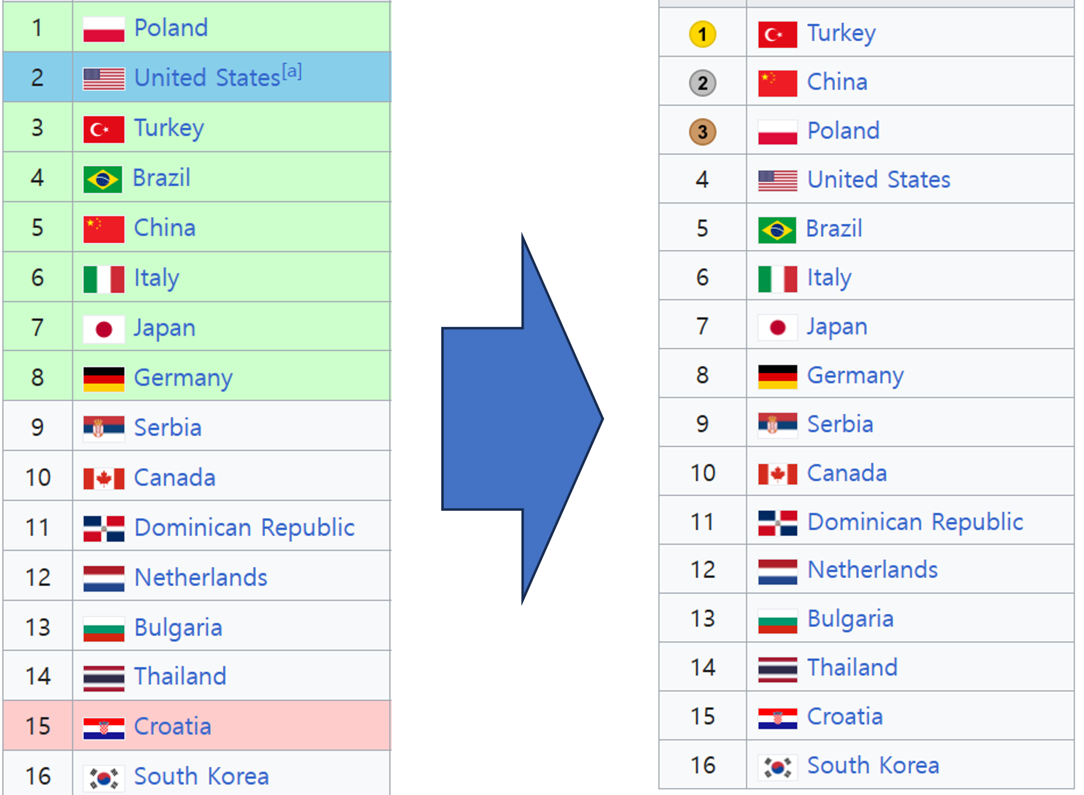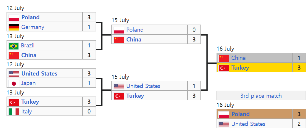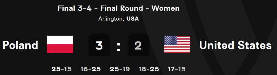 폴란드는 예선리그를 1위로 마무리하는 기염을 토했다. 라바리니가 잘 이끈 것 같았다. 4강에서 중국에 0-3으로 진 것이 옥의 티였다. 예선리그에서의 결과와는 반대의 결과를 보였다. 그래서 3~4위전으로 내려간 폴란드는 예선리그에서 2:3으로 진 기억이 있던 미국과 3위 결정전을 치르게 되었다. 예선리그에서 3:2로 이겼던 튀르키예에게 4강에서 1:3으로 져버린 미국 역시 3위 결정전을 치르게 되었다. 결국 예선 1, 2위였던 폴란드와 미국이 3위 결정전을 치르는 이상한 일이 일어났다.