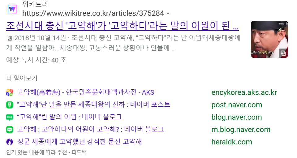 처음 링크된 기사 조선시대 충신 '고약해'가 '고약하다'라는 말의 어원이 된 이유 (ft. 세종대왕) 에서 이렇게 검색 된 이유를 알 수 있었다. 그 유명한(정형돈이 사랑한다던, 그리고 나도 정말 좋아하는) MBC '신비한 TV 서프라이즈'에서 고약해 에 대한 영상을 내보냈다고 한다.